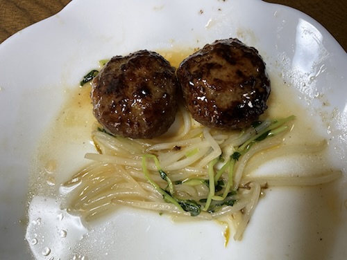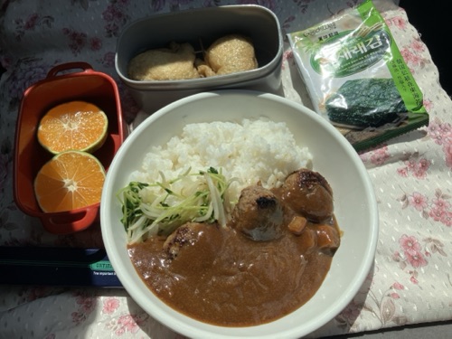 イスラエルさんが、4割引で買って来てくれていた、ミニハンバーグをレトルトカレーと一緒に笑顔
