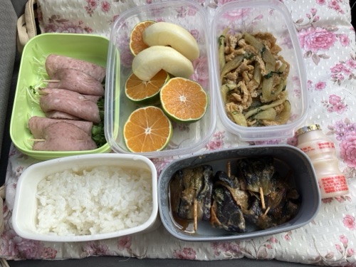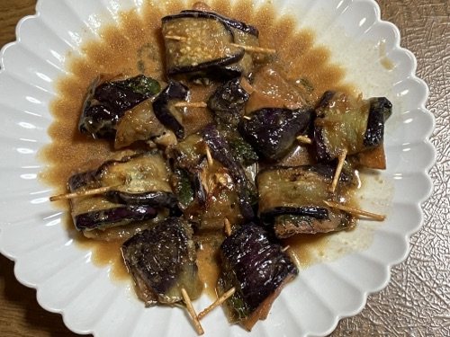 ほなす🍆、青じそ、ベーコン🥓、チーズを巻いて、焼肉のタレと蜂蜜🍯でお味付け………途中から、ベーコンがなくなって、ハムに🤗