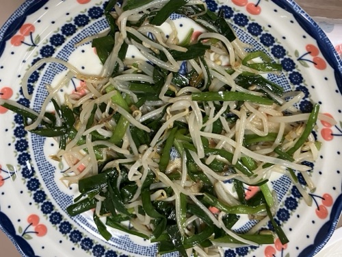*もやしとニラの鶏ガラと昆布つゆほんの少々でお味付け………これ、あっさり美味し~い٩( ᐛ )و