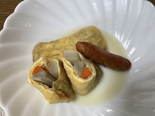 *油揚げを開いて、大根、人参🥕、ごぼうを巻いて煮ました。ウインナーもいれましたぁ。🤗✌️