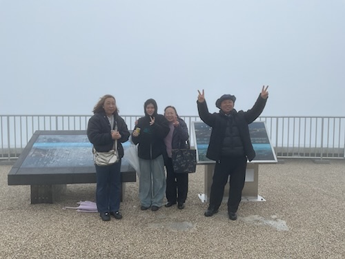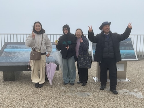 ロープウェイとスロープカーを乗り継いで!頂上まで上がって、礼拝しました。登っている時に、霧が追って来ているように、下からどんどん白くなって………頂上に着いた時は、いつもは360度見渡せて素晴らしい景色が広がっています♪夜景も綺麗で、日本三大夜景に入っています٩( ᐛ )و