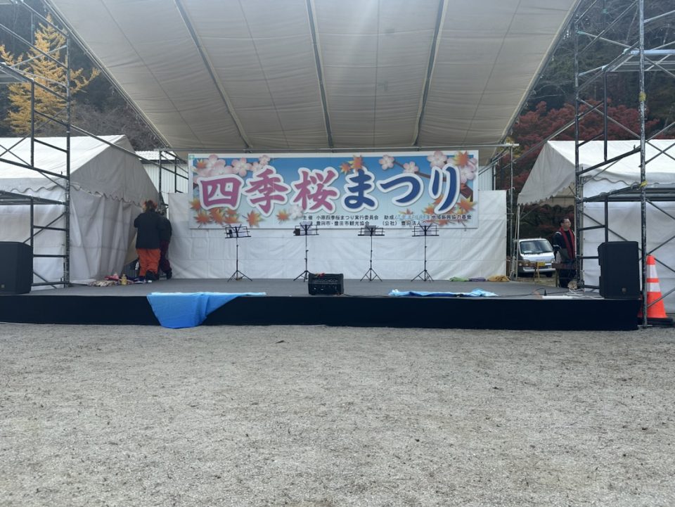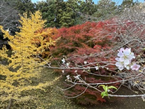 紅葉と桜のコラボが綺麗です。20分後にゴスペルライブが始まります。