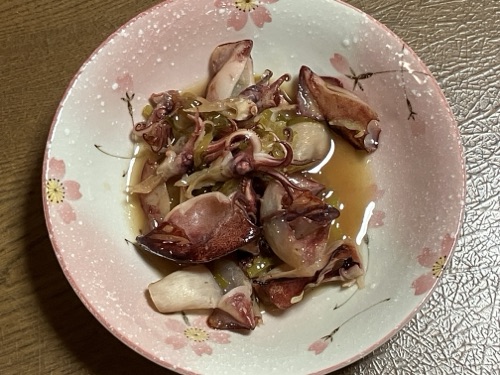*小さい半額ヤリイカが冷凍庫に………オリーブオイル🫒、ニンニク🧄、レモン汁🍋、蜂蜜🍯でお味付け…シラネギの青い部分も入れて。✌️🤗