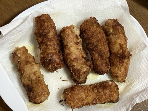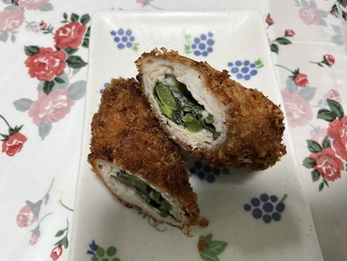 *豚肉に冷凍菜の花、スライスチーズを巻いて、フライに。スーパーでレシピカードを頂き、作って見ましたぁ🤭