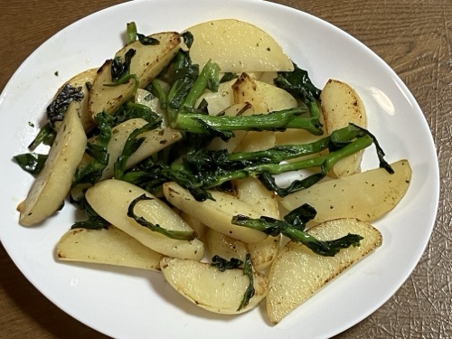 *じゃがいも🥔と冷凍菜の花を炒めて、マジックソルトとちょっとだけ昆布つゆでお味つけ