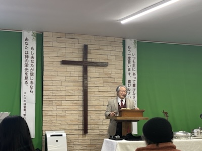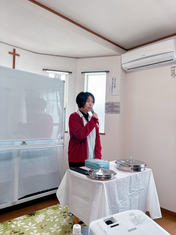 メッセージの時です。三木さんが、ローマ人への手紙5章3~5節から、「神様の戦い、賜物を用いて神に従う」ことを語ってくださっています。広島・呉サラ