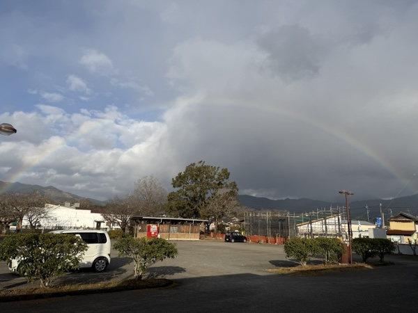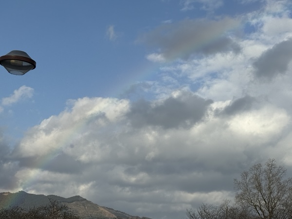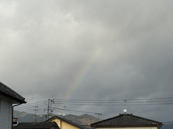 虹が見えていました。最初は光のかんけいで虹🌈になっているのかな?と思っていました。トイレに行くときに外をみたら、アーチの虹が出ていたのでびっくりしました。