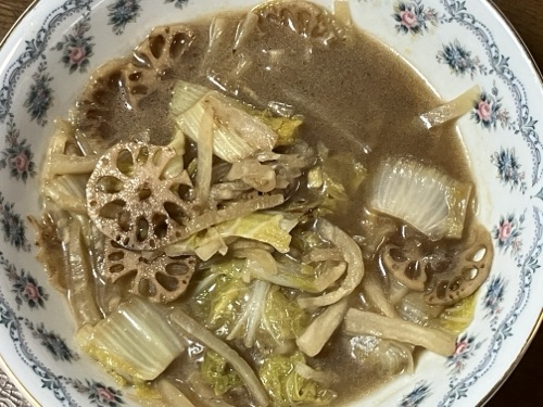 *お野菜の炒め煮(白菜、大根、レンコンを炒めて………味噌煮込み鍋の素、みりん、蜂蜜🍯でお味付け………美味しい🤗