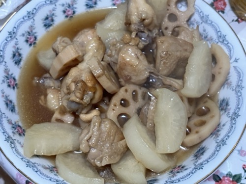 *鶏と根菜の煮物(鶏は、手羽元と少し残っていたもも肉を茹でて焼いて………お味は、お酢、昆布つゆ、みりん、お砂糖で。お肉が、やわらかくて✌️🤗