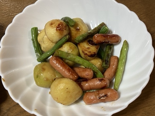 イスラエルさんが、ちっちゃいじゃがいも🥔を買って来て………レンジでチンして、皮をむいて、ミニウィンナーとインゲンも入れて、焼き肉のたれでお味つけ✌️🥰