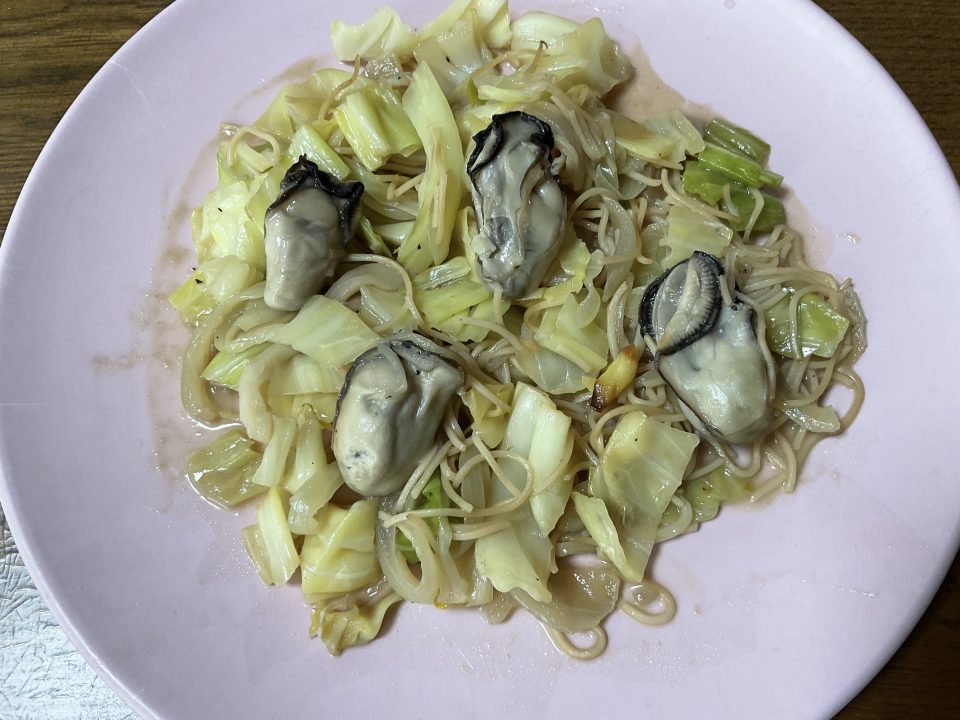 *98円也………キャベツ🥬、玉ねぎ🧅、もやし、半額から付き牡蠣🦪を炒めて、パリパリ麺を投入🥰✌️🤗